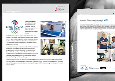 Institute of Sport, Exercise & Health folder and loose inserts for UCLH presentation to HM Government health and fitness seminar just prior to the Olympics. This had to conform to UCLH branding guidelines as well as accommodating the demands of various sponsors. Difficult but rewarding.