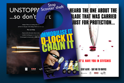 Part of a series of posters aimed at various targets in Islington. The scooter card was designed to be hung over the handlebars of scooters and the “Heard the one…” poster was specifically aimed at school teenagers who had taken to carrying knives to protect themselves and ended up having the knife used on themselves. Work we are proud of.